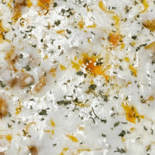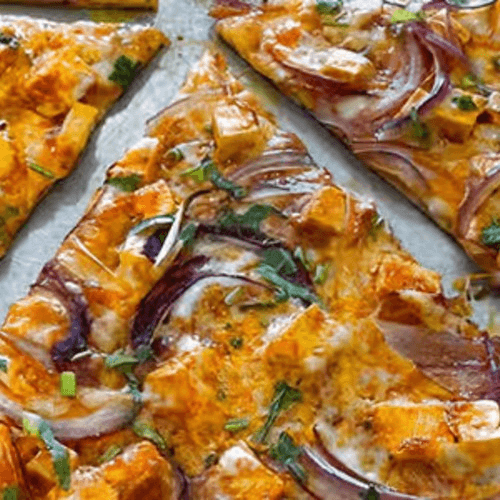 A Paneer cheese, onion, jalapeños, cilantro, mozzarella, on curry sauce