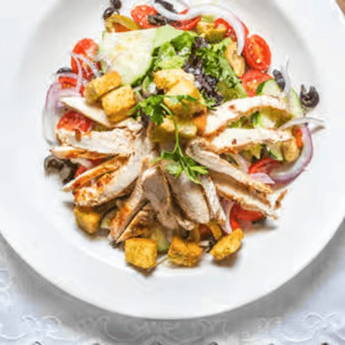 Lettuce, tomato, onions, olives, cucumbers, Romano cheese & croutons