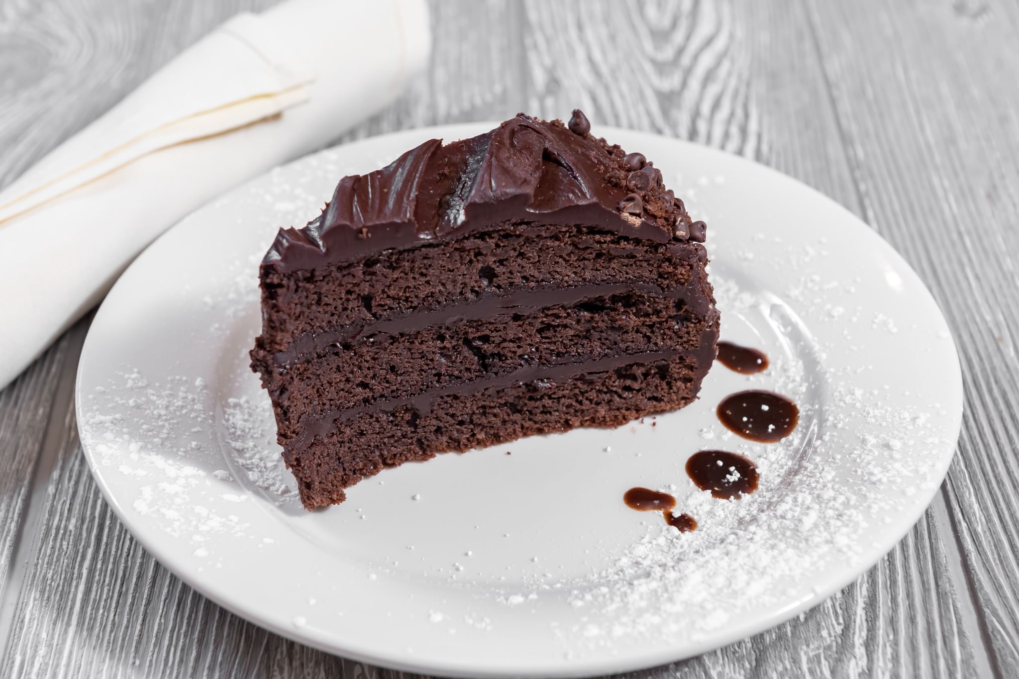 A big, rich slice of chocolate fudge cake drizzled with chocolate sauce