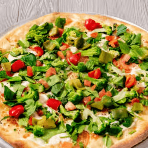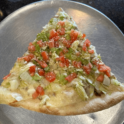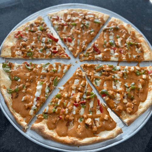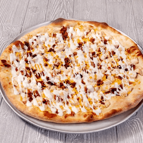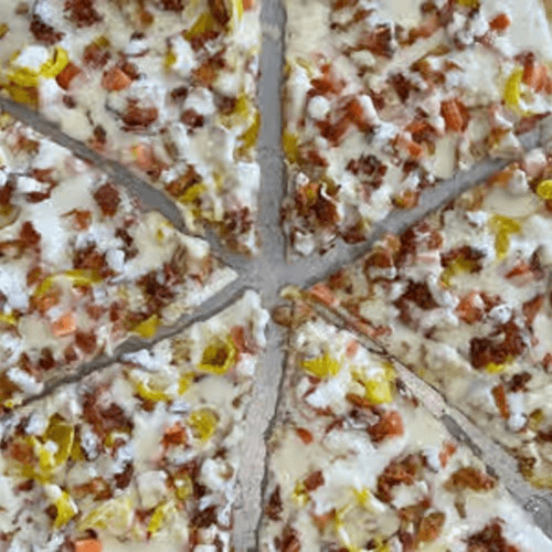 White pizza with General TSO's sauce, breaded chicken, broccoli and mozzarella cheese.