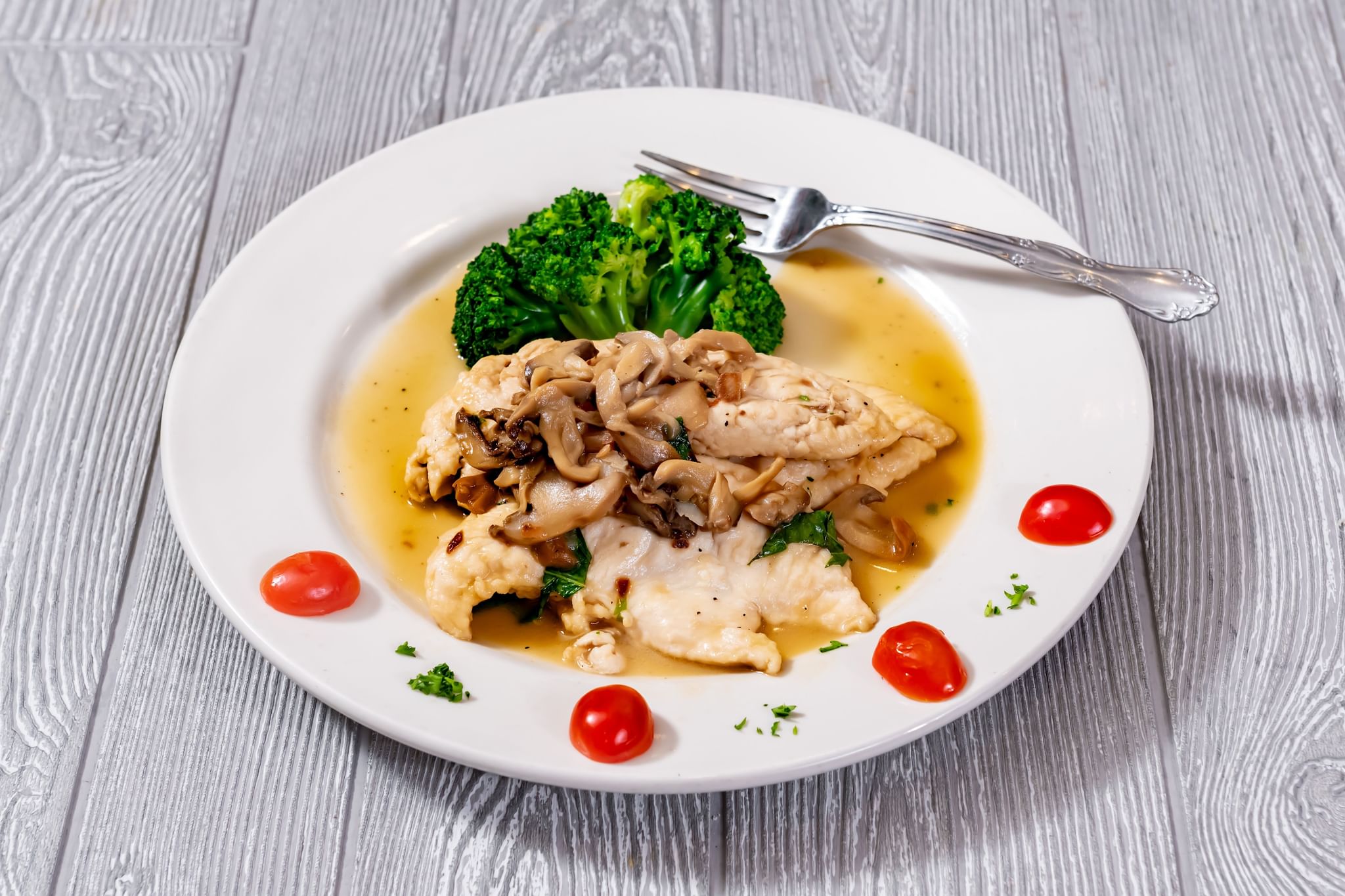 In a lite wine butter sauce with cherry tomatoes & onions